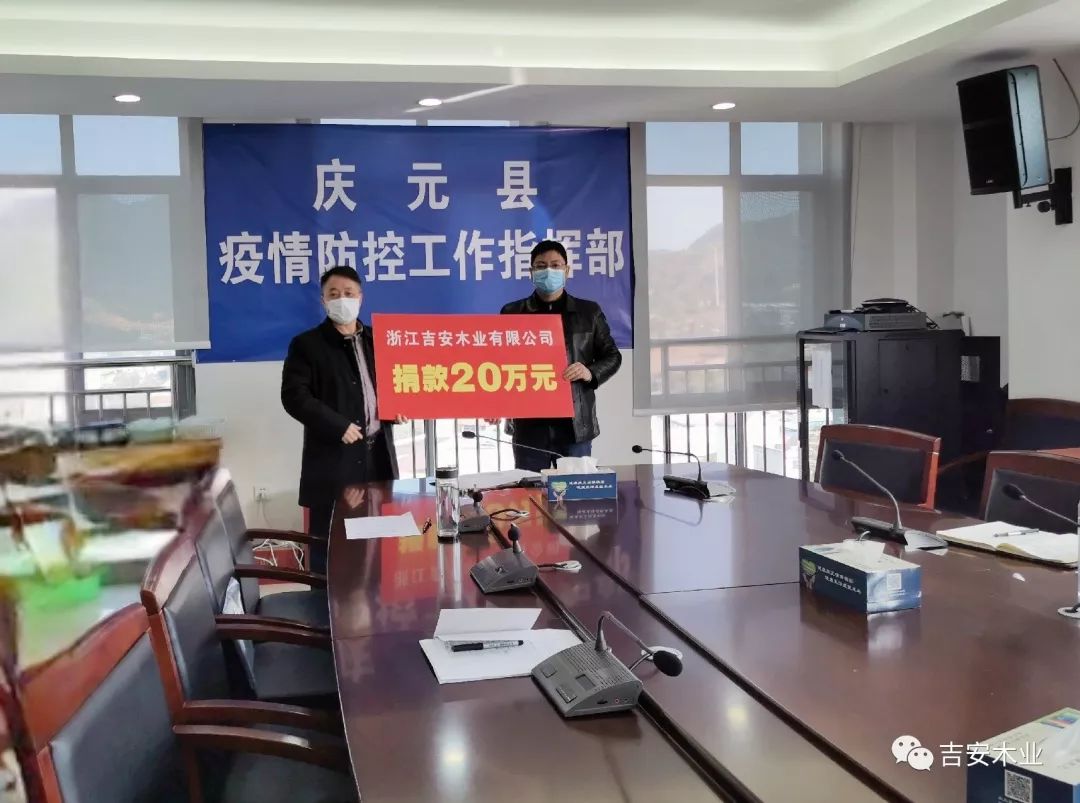 2020年2月1日; 吉安木業(yè)董事長吳靜安赴疫情防空工作指揮部,捐款20萬元。全力支持我縣新型冠狀病毒疫情防控工作,專項采購醫(yī)療用品、口罩、防護(hù)服等急需物資。